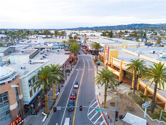 Aerial view of a commercial street lined with palm trees, featuring buildings and a road with cars.MLS ID #DW25279079