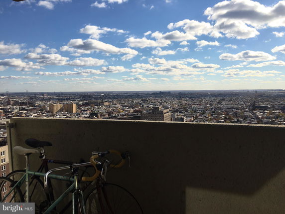 Wide angle view from a high balcony overlooking a cityscape with buildings and clear sky.MLS ID #PAPH2285416